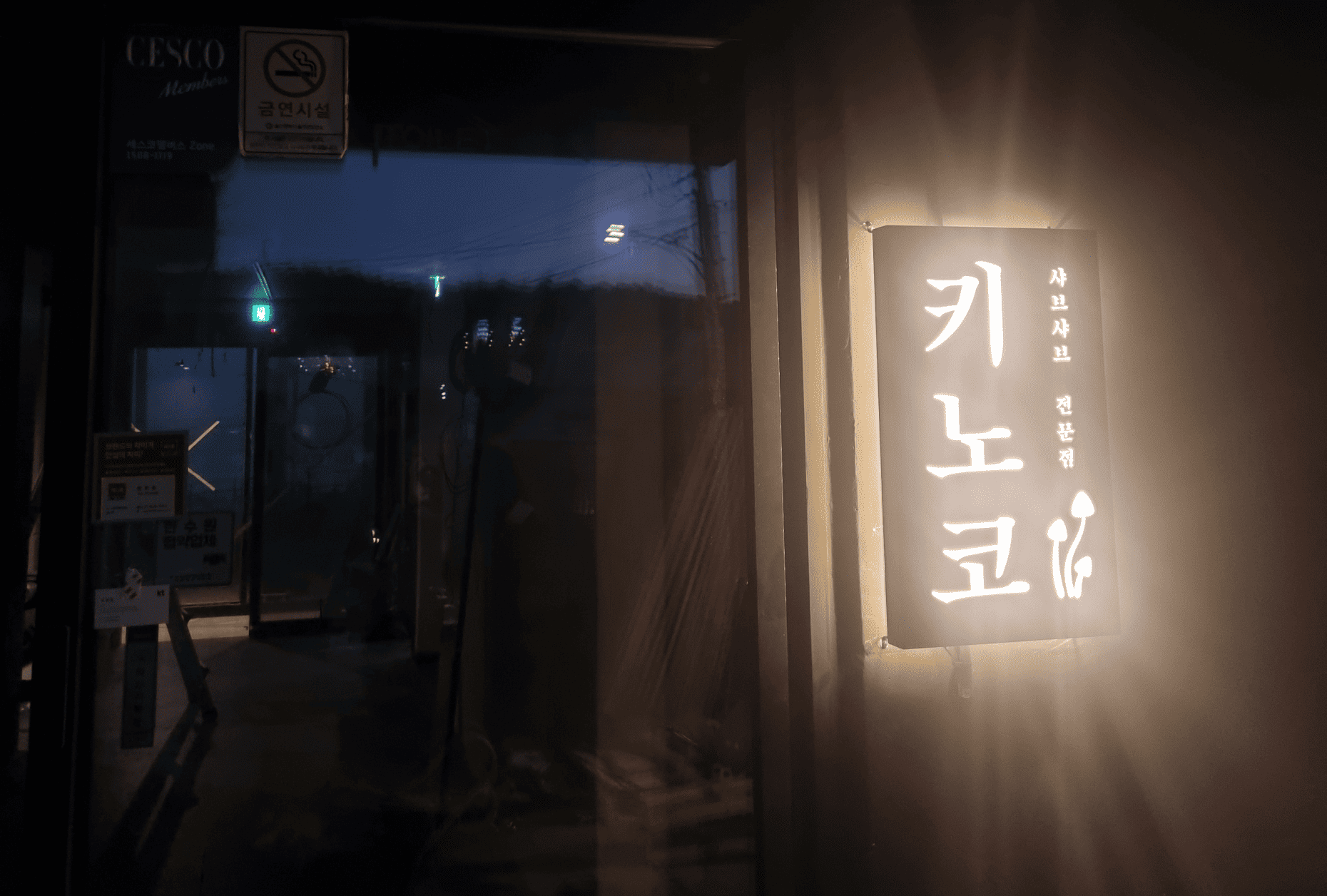 오늘은 세련된 블랙 톤 외관에 깔끔한 화이트 조명 간판으로