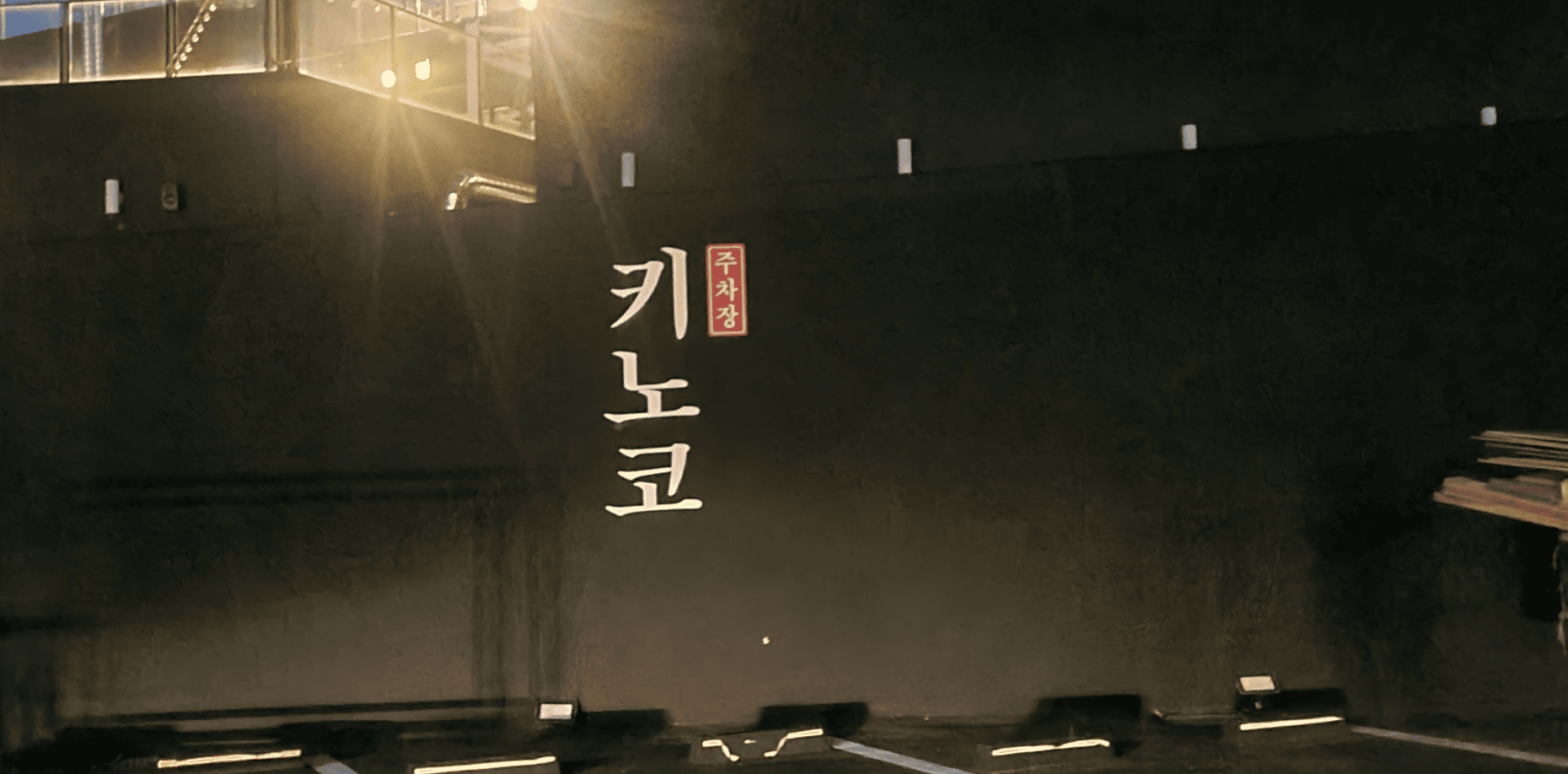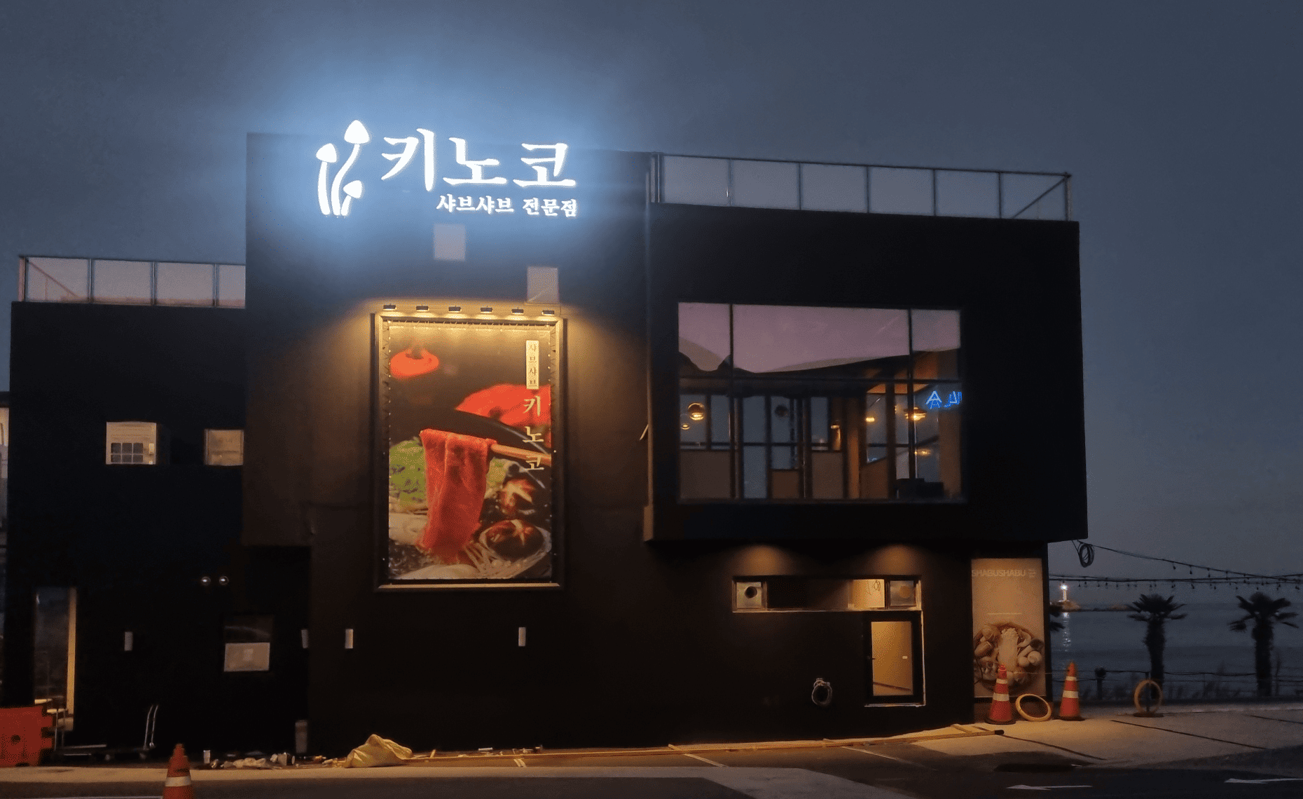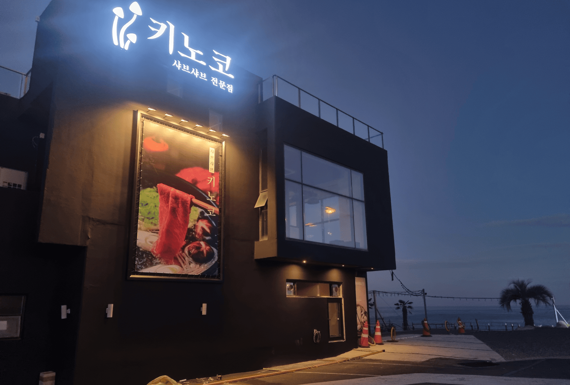 특히 블랙 배경과 대비되는 간판 디자인은 브랜드 로고와 콘셉트를 선명하게 드러내며,