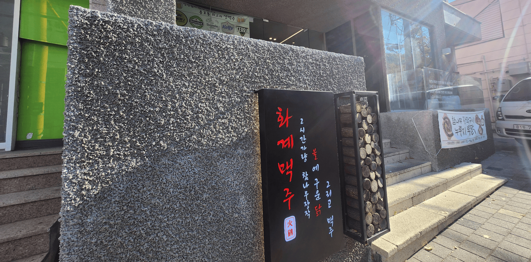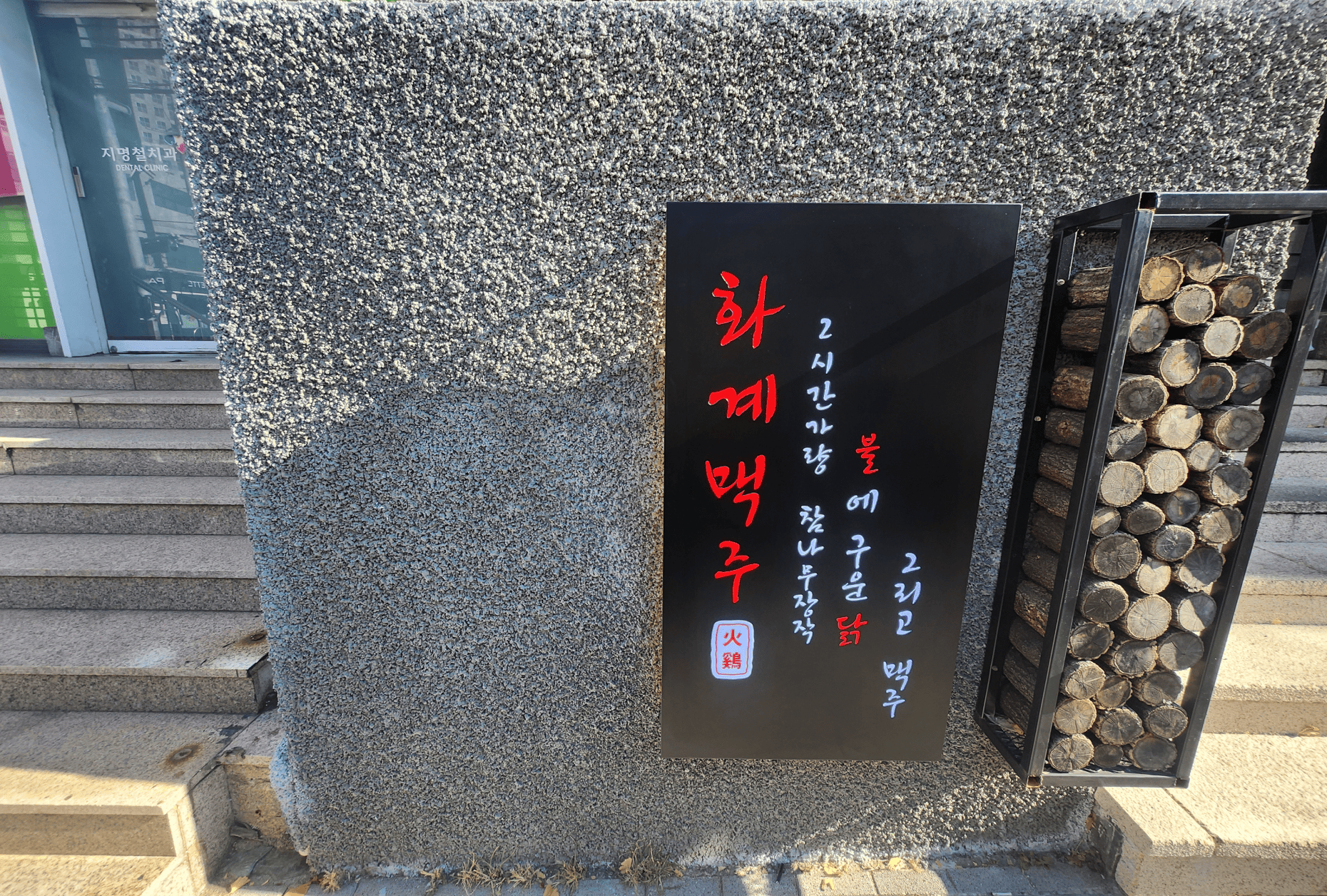입구 좌측에는 장작을 실제 연출 구조물과 함께 결합해 매장의 정체성을 한눈에 전달할 수 있도록 시공했습니다.